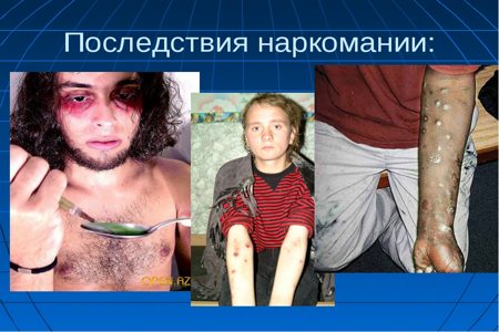 Наркомания характеризуется неблагоприятными психическими, соматическими и социальными последствиями. Особенно это проявляется в период вынужденного воздержания от привычного приема наркотиков. У наркоманов выявляется психическая и физическая зависимость от наркотиков, стремление увеличить дозу для получения еще большей эйфории, благодушия, хорошего настроения, прилива сил, легкости, отрешенности от окружающего мира и возникающих проблем. Отсюда болезненная потребность в повторном приеме наркотиков и активные действия, направленные на их приобретение. Все это приводит к заострению черт личности, соматоневрологическим и психическим расстройствам, а затем и к психической, биологической и социальной деградации. Нередко психиатры диагностируют у наркоманов психотические состояния с сумеречным помрачением сознания, бредом, галлюцинациями и другими проявлениями нарушений психики.