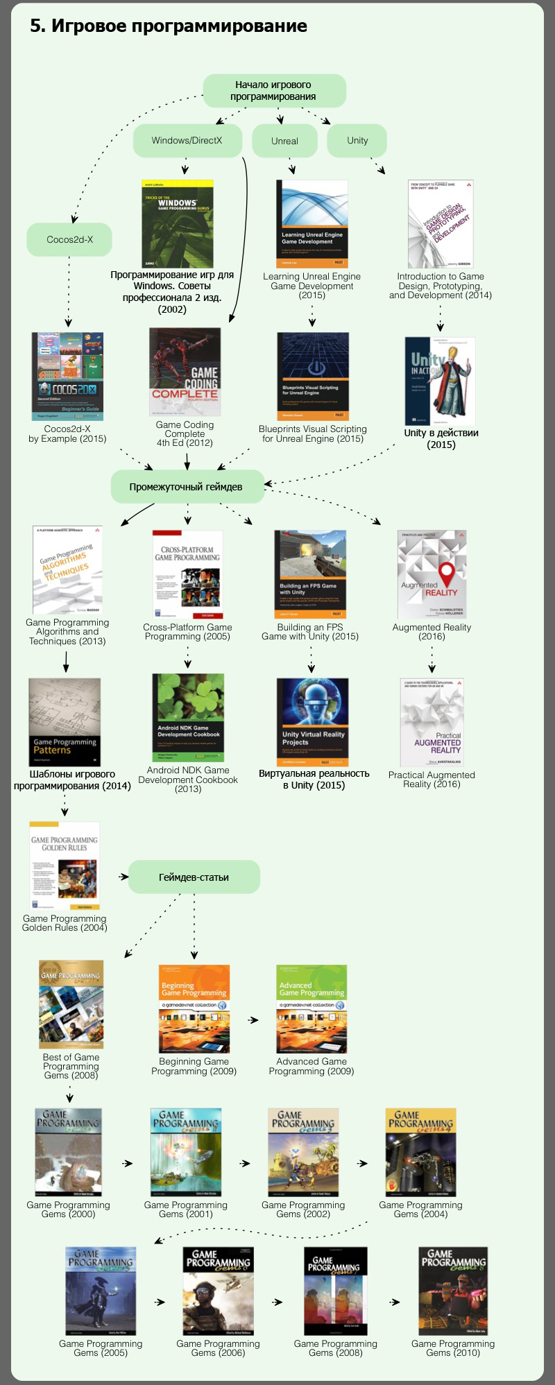 С геймдевом связано много областей, и каждый этап обучения основан на этапе предшествующем. Например, не стоит сразу перескакивать на игровые движки . Начните с разработки ПО, изучения математики с заточкой под программирование игр и только после переходите к геймдеву. Каждый из представленных этапов – это пошаговое руководство , включающее в себя книги и другие материалы.