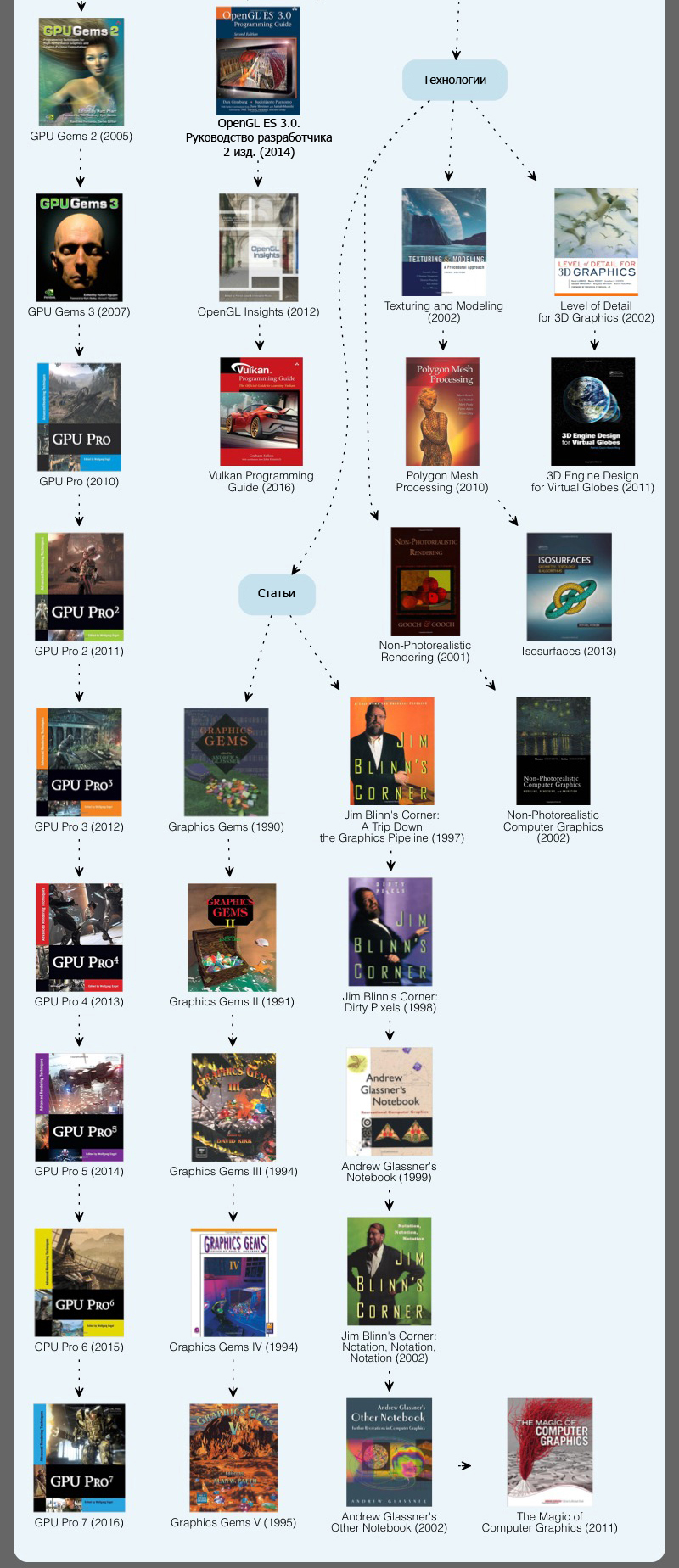 Недаром этот раздел самый большой. Сюда включены основы программирования с Real-Time 3D, DirectX и OpenGL. Все дополнено информацией о рендеринге и технологиях. Отдельного внимания в подборке удостоились Direct3D и OpenGL.