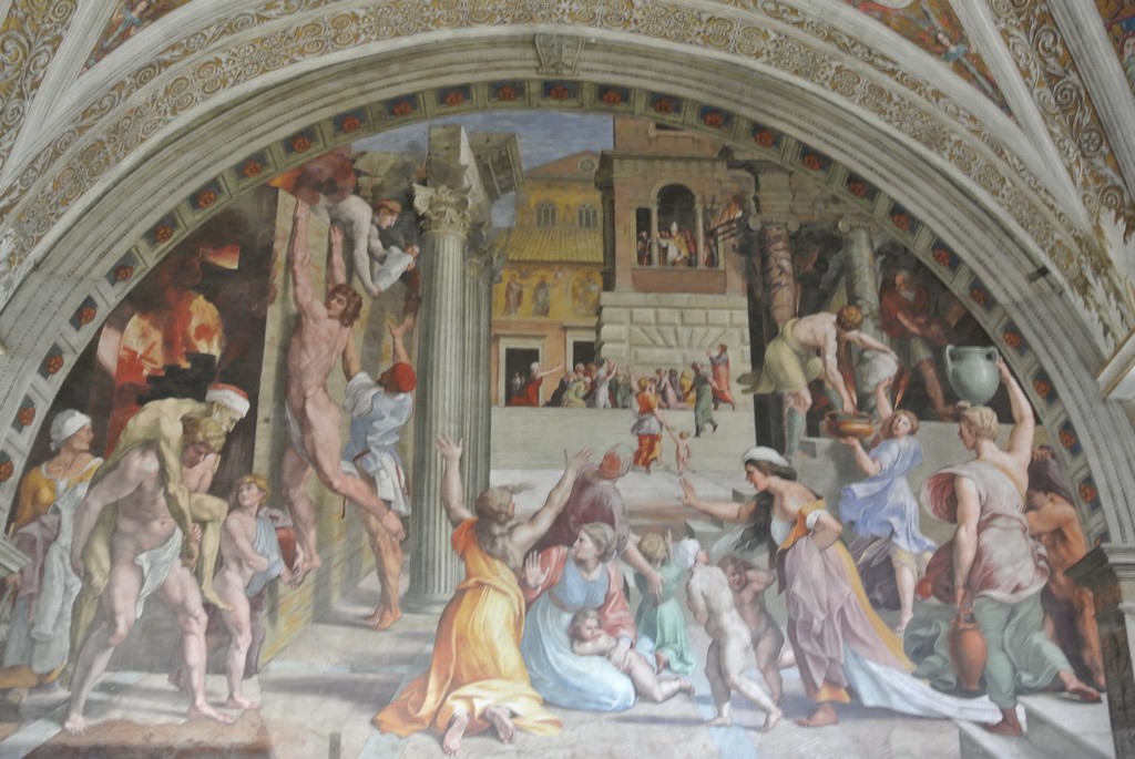 На фреске «Пожар в Борго» изображен пожар 847 года. Тогда папа Лев IV чудесным образом остановил его, осенив знаком креста спасающуюся от пожара толпу.