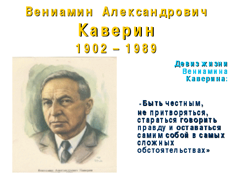 Родился 6 апреля 1902 года в Пскове в семье музыканта. В 1912 поступил в псковскую гимназию. "Друг моего старшего брата Ю.Тынянов, впоследствии известный писатель , был моим первым литературным учителем, внушившим мне горячую любовь к русской литературе", - напишет Каверин. Шестнадцатилетним юношей он приехал в Москву и в 1919 закончил здесь среднюю школу. Писал стихи. В 1920 перевелся из Московского университета в Петроградский, одновременно поступив в Институт восточных языков, окончил оба. Был оставлен при университете в аспирантуре, где в течение шести лет занимался научной работой и в 1929 защитил диссертацию.. В 1921 вместе с М.Зощенко, Н.Тихоновым, Вс. Ивановым был организатором литературной группы "Серапионовы братья". Впервые напечатался в альманахе этой группы в 1922 (рассказ "Хроника города Лейпцига за 18... год"). В это же десятилетие им написаны рассказы и повести ("Мастера и подмастерья" (1923), "Бубновая масть" (1927), "Конец Хазы" (1926), повесть о жизни ученых "Скандалист, или Вечера на Васильевском острове " (1929). Решил стать профессиональным писателем, окончательно посвятив себя литературному творчеству В 1934 - 36 пишет свой первый роман "Исполнение желаний", в котором ставил задачу не только передать свои знания жизни, но и выработать собственный литературный стиль. Это удалось, роман имел успех. Самым популярным произведением Каверина стал роман для юношества - "Два капитана", первый том которого был завершен в 1938. Начавшаяся Отечественная война остановила работу над вторым томом. Во время войны Каверин писал фронтовые корреспонденции, военные очерки, рассказы. По его просьбе был направлен на Северный флот. Именно там, повседневно общаясь с летчиками и подводниками, понял, в каком направлении пойдет работа над вторым томом "Двух капитанов". В 1944 второй том романа был опубликован. В 1949 - 56 работал над трилогией " Открытая книга ", о становлении и развитии микробиологии в стране, о целях науки, о характере ученого. Книга завоевала популярность у читателя. В 1962 Каверин опубликовал повесть "Семь пар нечистых", рассказывающую о первых днях войны. В этом же году была написана повесть "Косой дождь". В 1970-е создал книгу воспоминаний "В старом доме", а также трилогию "Освещенные окна", в 1980-е - "Рисунок", "Вечерний день". Умер В.Каверин 2 мая 1989.Приложение. Слайд 4.
