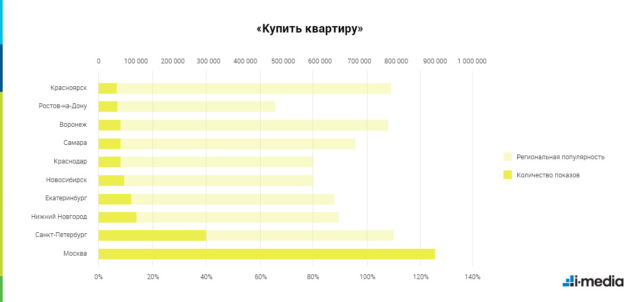 Любопытно разнится интерес к приобретению недвижимости в регионах. «Купить дачу» хотят больше всего пользователей из Новосибирска, «купить квартиру» — из Нижнего Новгорода, а «купить дом» — из Екатеринбурга. Повышенный региональный интерес к дачам — у жителей Красноярска, к квартирам — у Красноярска и Воронежа, а к домам — у Воронежа и Краснодара. Примечательно, что по региональному интересу к дачам Красноярск опередил обе столицы: показатель составил целых 161%.