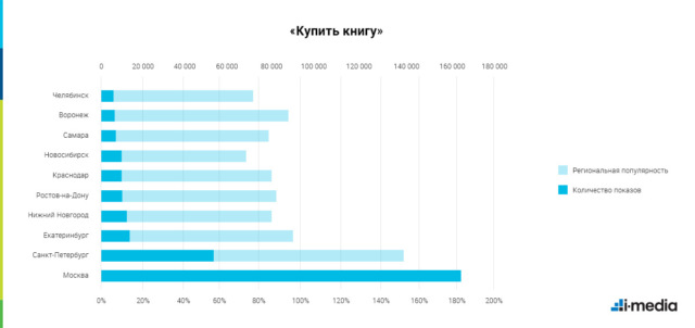 Самым читающим городом был признан Екатеринбург — там лидируют и количество запросов «купить книгу», и соответствующий региональный интерес. Мы решили проверить, читают ли в «культурной столице» больше. Оказалось, что московский показатель заинтересованности все же выше — 173% против 155%.