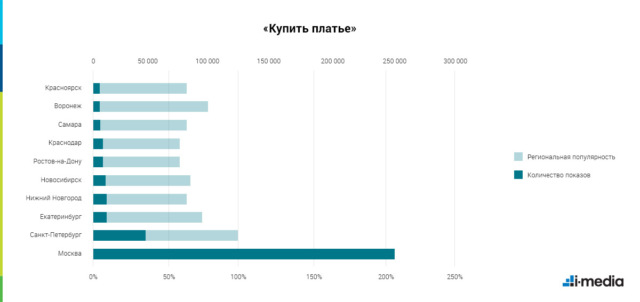 Покупать платья жаждет Екатеринбург: и количество запросов, и показатель интереса у него выше, чем у остальных регионов. Но максимально заинтересованы в платьях москвичи: из всех рассматриваемых тематик именно этот запрос показал самый высокий коэффициент местного регионального интереса — 206%.