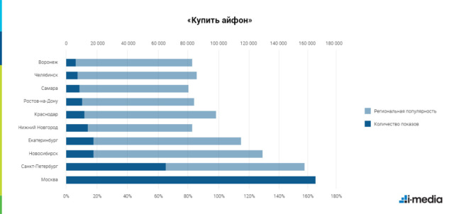 Также жители Новосибирска очень хотят «купить айфон» — региональная популярность этого запроса здесь на третьем месте после столиц. Наибольший интерес к смартфону от Apple проявляют в Санкт-Петербурге — там уровень региональной популярности iPhone достиг 159% против 140% в Москве.