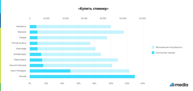 И, наконец, посмотрим, какой регион оказался наиболее подвержен влиянию моды. «Купить спиннер», кроме пользователей из Москвы и Санкт-Петербурга, больше хотят в Нижнем Новгороде и Новосибирске. Очевидные причины для этого мы найти не смогли, так что будем считать, что всё дело в двух буквах «н» в названии игрушки.