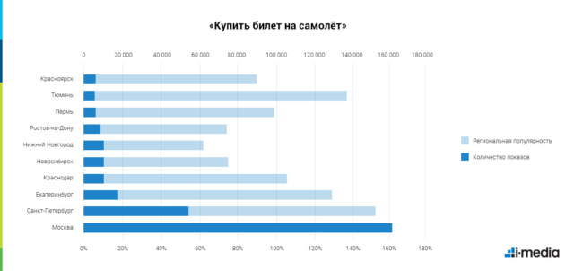«Купить билет на самолёт» хотят больше всего пользователей из Екатеринбурга и Краснодара (если не считать жителей обеих столиц). При этом повышенный региональный интерес к билетам — в Тюмени: