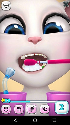 Все детки знают, что первым делом нужно обязательно чистить зубки и принимать ванную по утрам, наша очаровательная Анжела тоже привыкла к данным процедурам, поэтому если нажать на ванный столик, то открывается несколько функций: почистить зубы и нанести макияж. После того, как мы приведем зубки Кошечки в порядок, можем начинать наносить косметику.