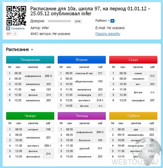Каждое расписание, созданное на сайте Schoodle, имеет свой уникальный QR-код. Для чего это нужно? Конечно же для удобства! К примеру, Вы распечатали и повесили расписание на коридоре. Ученики, проходя мимо, могут просканировать QR-код своим смартфоном и сразу получить доступ к мобильной версии расписания, чтобы оно всегда было под рукой! И, как я уже упоминал, можно опубликовать расписание на сайте, используя специальный виджет – просто добавляете код на страницу сайта, и готово! Кстати сервис имеет мобильные приложения для Android и iOS.