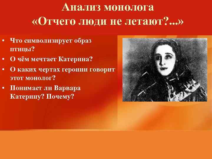 Анализ монолога «Отчего люди не летают? . . . » Что символизирует образ птицы? О чём мечтает Катерина? О каких чертах героини говорит этот монолог? Понимает ли Варвара Катерину? Почему?