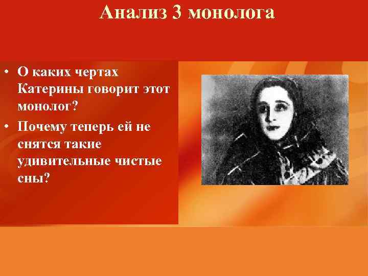 Анализ 3 монолога О каких чертах Катерины говорит этот монолог? Почему теперь ей не снятся такие удивительные чистые сны?