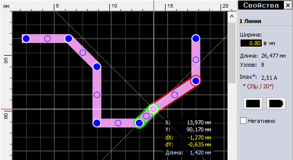 В этой панели можно изменить значение ширины линии, посмотреть ее длину, количество узлов и подсчитанный максимально допустимый ток.