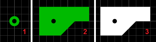 Формы контактных площадок не ограничиваются этим списком - их можно сделать любой формы. Для этого необходимо разместить обычный контакт (1), а вокруг него нарисовать площадку нужной формы (2). Причем следует не забывать о маске - необходимо вручную открыть от нее весь контакт (3) (о маске см. ниже).