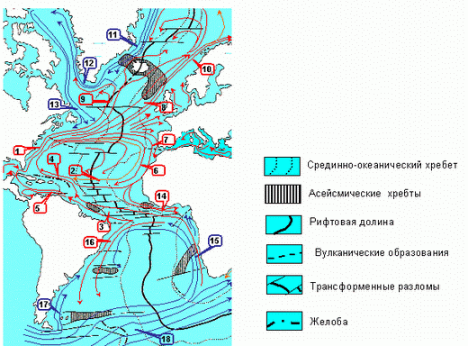 Тектоническая схема и система течений Атлантического океана.