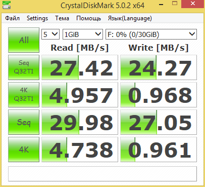 Утилита CrystalDiskMark показала последовательную скорость чтения: 43,4Мб/с, что немного не дотягивает до заявленной до 48Мб/с, скорость записи: 37,8Мб/с.