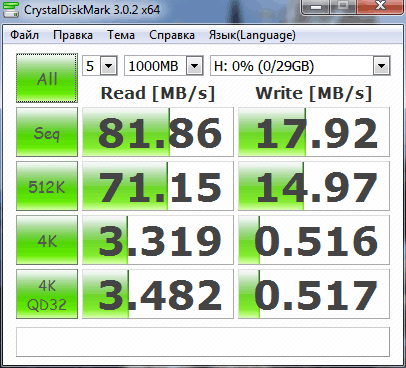 Утилита CrystalDiskMark показала последовательную скорость чтения: 81Мб/с, что выше заявленной 45Мб/с, но зато скорость записи одна из самых низких: 17Мб/с (но тоже выше заявленной 10Мб/с).